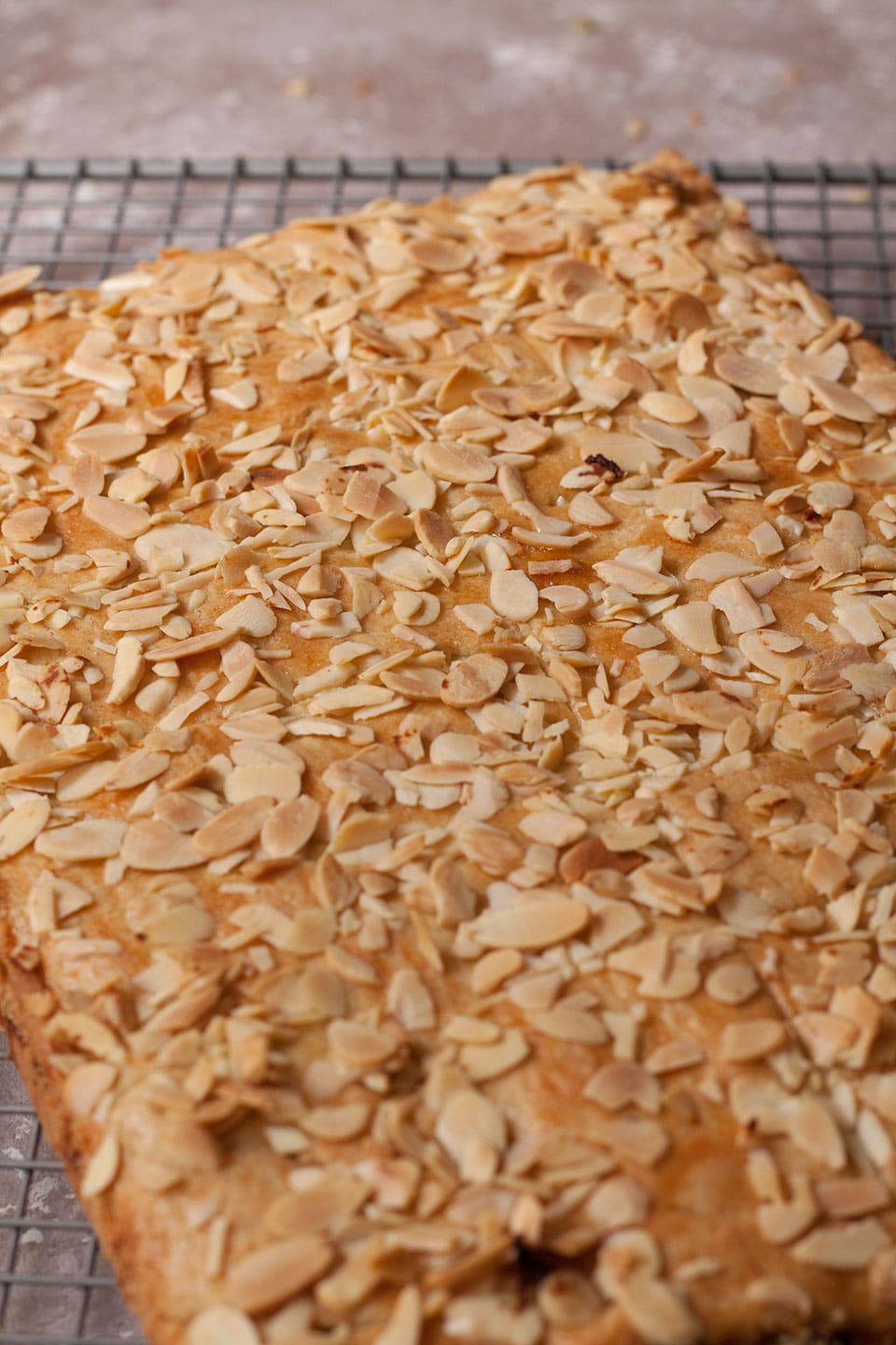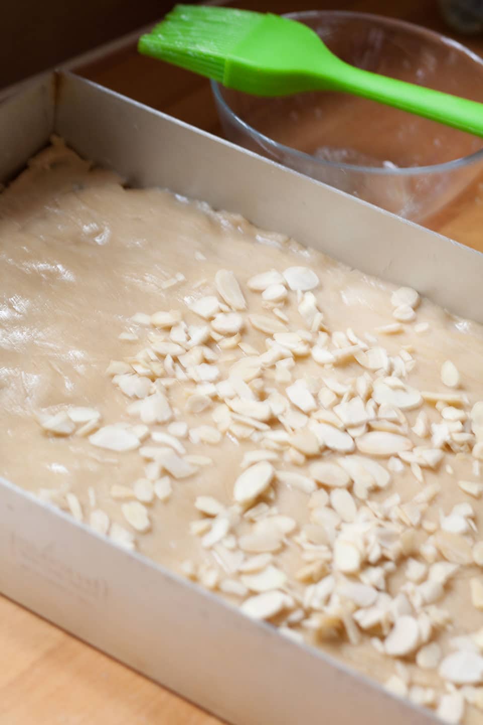 - Brush the top of the pastry with a little egg white, then sprinkle the almonds on top.