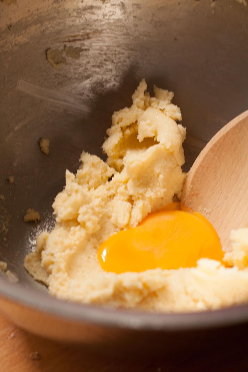 - Place the butter and sugar in a mixing bowl and beat until soft and well combined. Add the egg yolk and almond extract and most of the egg white. Beat to combine.