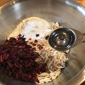 - Place the almonds, cranberries, icing sugar and gin in a bowl and mix well. Spread out on a baking sheet lined with non-stick baking parchment.
