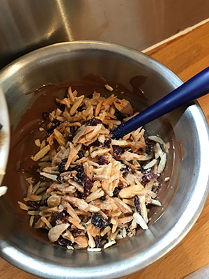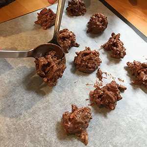 - Stir in the nut mixture. Place spoonfuls of the mixture on to a baking sheet lined with parchment and leave to set.
