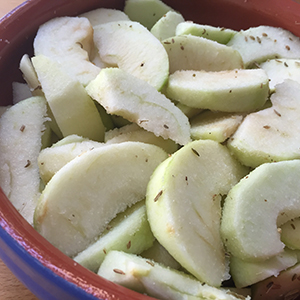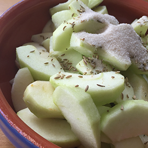 - Lightly crush the fennel seeds in a pestle and mortar, or between two large spoons and sprinkle over the apple slices. Sprinkle over the caster sugar. Toss in the dish to combine and level as best as you.