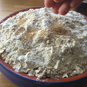- Rub the remaining butter into the flour until the mixture resembles coarse breadcrumbs. Add the caster sugar, chopped nuts, and the oats and stir until well combined. Set aside.
