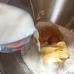 - Add the eggs and softened butter. Beat well for about 3–4 minutes until smooth. You will find it easier to use a stand mixer if you have one.