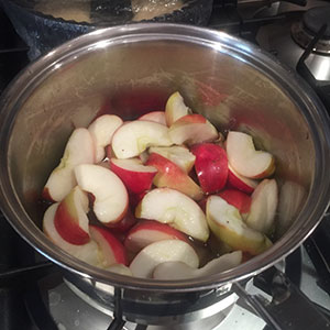 - Reduce the heat, cover and cook for 5 minutes until the apples are just tender. Remove with a slotted spoon and set aside. Strain the syrup to remove the cardamon pods and thyme.