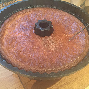 - When the Savarin is baked, allow to cool in the tin for a few minutes. Prick the base a few times with a skewer and spoon over some of the syrup.
