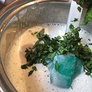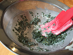 - Strain the mixture though a fine sieve, pressing the basil firmly with a spoon.