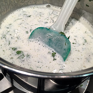 - Add the chopped basil and cook gently stirring constantly until the mixture thickens very slightly.
