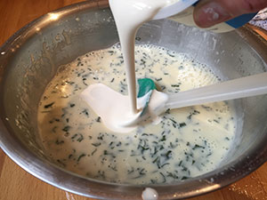 Back at home I set about trying to replicate the ice-cream. Starting with a basic egg custard (the base of many ice-creams), I added chopped basil. The one (minor) short coming of the ice-cream at the White horse was its slightly muddy coloured green, not enough to put you off, but equally not the bright green you might expect.