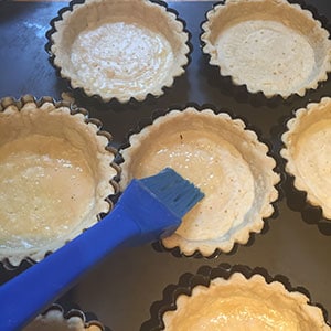 Sometimes the pastry may crack a little. Brushing the pastry with a little beaten egg immediately after removing it from the oven will seal it and will later on stop any liquid filling from leaking out. The hot pastry should set the egg layer but, if it has cooled too much and the egg remains wet, simply pop them back into the oven for a minute.
