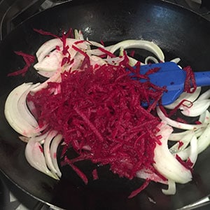 - Meanwhile, heat the oil in a frying pan and sauté the onion for 1-2 minutes. Then add the beetroot and cook until soft, stirring frequently – about 10 minutes.
