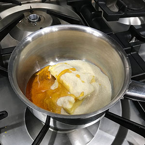 - Place the butter, sugar and golden syrup in a small pan over a low heat. Heat gently stirring until the butter melts and the sugar dissolves. Do this slowly and make sure the sugar has dissolved before removing from the heat.,