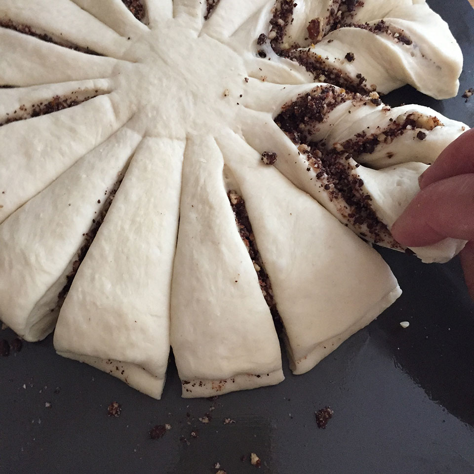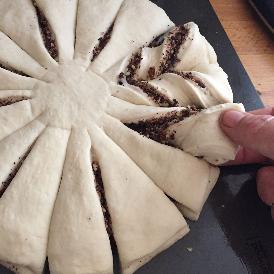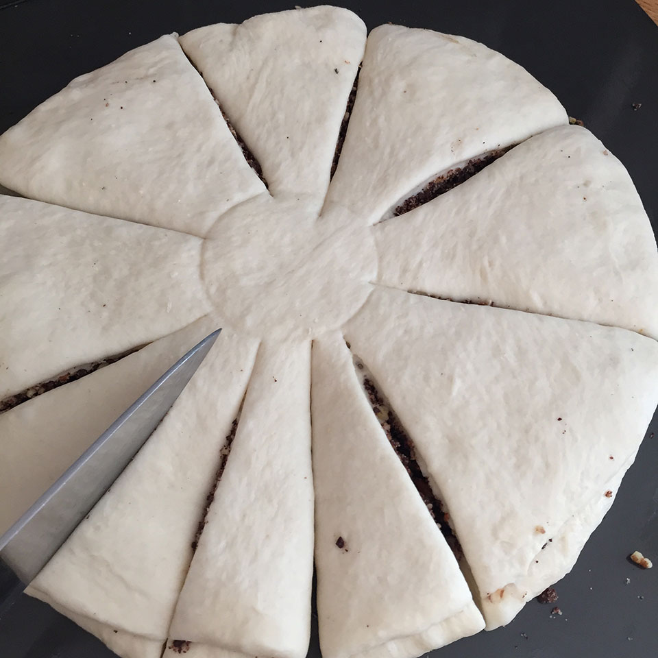 • Use a small glass or cookie cutter to mark a circle in the centre of the dough, then cut the dough into 16 equal sections.