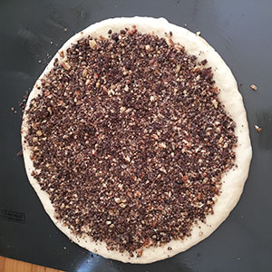 Sprinkle the filling over the dough leaving a boarder around the edge. Cover with the another circle of dough.