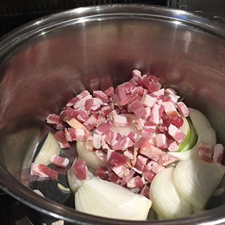 • Place the bacon and onions in a large saucepan and dry fry until the onion is softened and the bacon is browned, about 5 minutes. Start over a low heat until the fat from the bacon begins to run then increase the heat slightly.