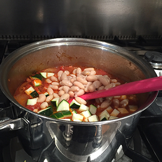 • Add the beans and courgettes and simmer for 10 minutes or until the vegetable are just tender.