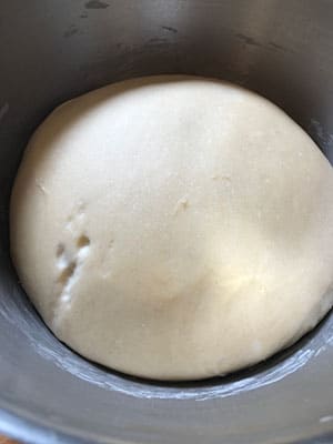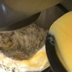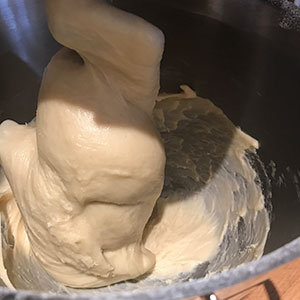 - Beat the eggs in a bowl to break up then beat in the butter mixture. With the mixer on slow, gradually mix into the flour to forms a wet sticky dough. Increase the speed and mix for another 5 minutes until the dough is smooth, shiny and elastic.