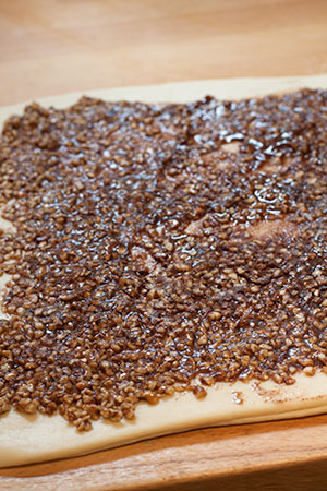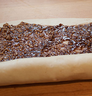 - Lightly grease two, 900g loaf tins. Cut the dough into two pieces and roll one piece into a 30cm square. Spread half the filling over the square and roll up tightly like a Swiss roll. (For more swirls in your loaf roll, continue rolling into a thinner rectangle.)