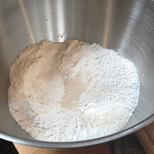 - Place the flours in the bowl of a stand mixer fitted with a dough hook and stir in the salt, sugar and yeast.