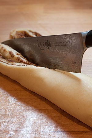 - Cut the dough lengthwise in half and place the two pieces next to each other and twist together by lifting each strand over each other. Try making at least 4 twists then line up and tuck into one of the prepared loaf tins.