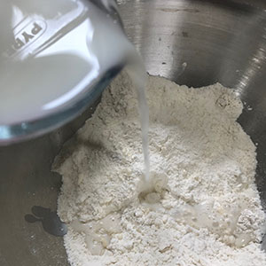 - Heat the milk and water together until luke warm, then add to the flour mixture and mix to a soft dough. Cover and leave in a warm place for 30 minutes.