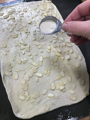 - Carefully lift onto a baking sheet , the dough is elastic so may shrink back in size, if so gently pull to stretch it back again. Brush all over with olive oil and then sprinkle with half of the caster sugar and half of the nuts if using.