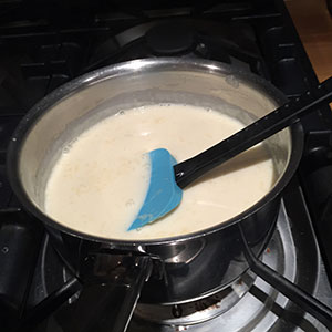 Heat the cream, coconut milk and sugar together.