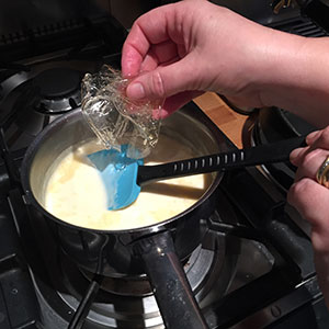 • Pick up the gelatine sheets one at a time and squeeze out the excess water and add to the pan. Stir until the gelatine has completely dissolved.