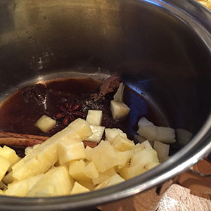 • Add the pineapple and heat gently for 3–4 minutes. Remove from the heat cover and allow the flavours to infuse for several hours.