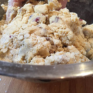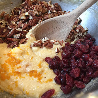 - Add the orange zest, juice, nuts and cranberries and beat until well combined.