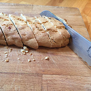 - When the logs are cool enough to handle, cut the pieces diagonally into 1cm thick slices. Place cut side down on the baking sheets and return to the oven for 10 minutes until crisp and golden. Allow to cool.
