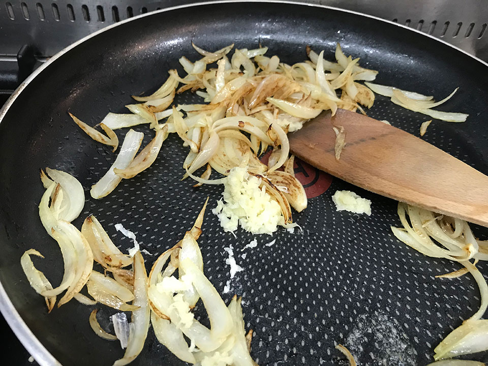 - Add the garlic and stir over the heat for a minute or two. Then add the butter and mushrooms. Cook the mushrooms, stirring frequently until softened. Transfer the mushrooms and onions to a plate and set aside.