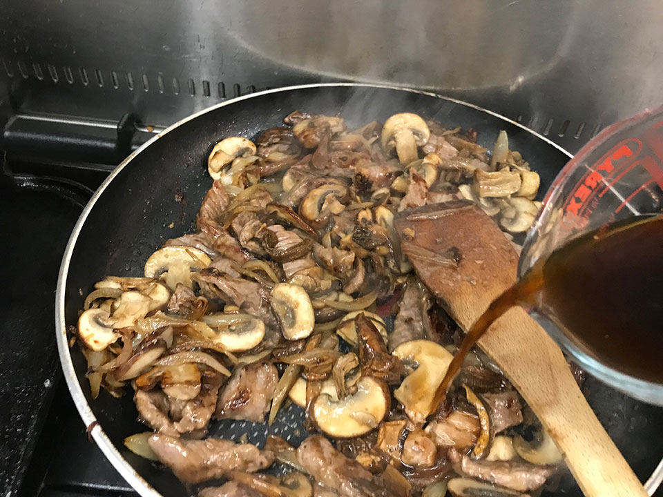 - Heat the remaining oil in the pan and add the beef strips. Toss over a medium-high heat until browned.