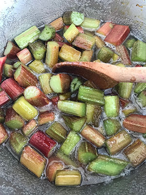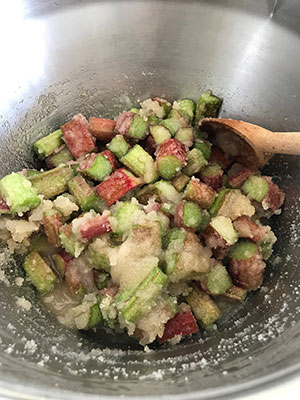 Rhubarb produces plenty of liquid once it starts to cook. To start the juices going, I mixed the rhubarb with the sugar and elderflower cordial which I think adds a nice hint of flavour to the finished jam. Leave it for an hour or so until the juices begin to weep from the rhubarb. This provides just enough liquid to help prevent the sugar from burning on the base of the pan. As the rhubarb cooks more and more juices are released and the sugar will dissolve. Do this over a low heat stirring constantly. You will know when all the sugar has dissolved as it will not feel gritty against the pan anymore as you stir it.