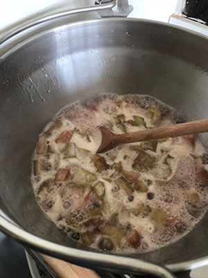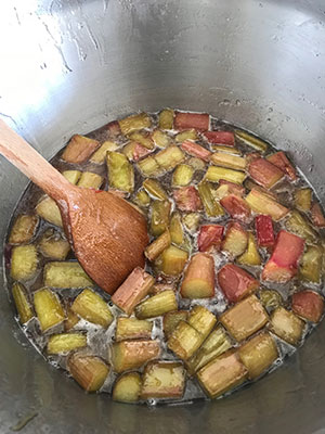 - Place rhubarb, sugar, elderflower cordial into a preserving pan or very large saucepan and stir together to mix. Leave to stand for an hour or so.