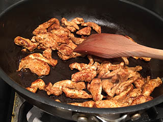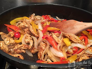 - Add the chicken to the pan and cook stirring frequently until the chicken has changed colour about 3 – 4 minutes, then return the peppers and onion to the pan and cook for a few more minutes until the chicken is cooked through and piping hot.