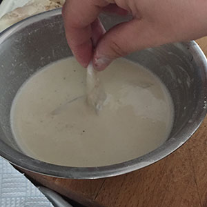 - The batter is really thin and it is tempting to want to add some flour to thicken it, but try to resist! Unlike the thick batter we have when we make fish and chips, this batter should be very light and barely there.