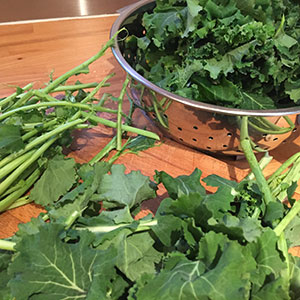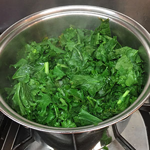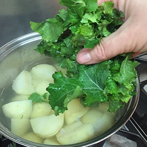- While the potatoes are cooking, strip the kale leaves from the stems and discard the stems. Wash well then thickly shred. Add to the potatoes for the last 5 minutes of cooking.