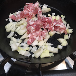 - Heat 1 tablespoon of oil in a frying pan and add the onions and bacon, if using. Cook over a low heat for 5 minutes until softened and beginning to colour. Add to the drained potatoes and kale.