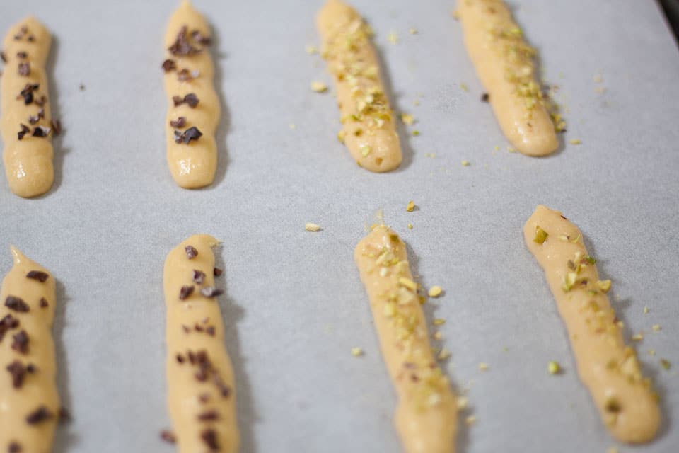 Looking to put my own stamp on this bake I decided to sprinkle some of mine with some chopped pistachios and some with cocoa nibs. Cocoa nibs gives a little unsweetened, nutty chocolate element to the biscuits which would go very well with creamy chocolate dessert and ice cream.