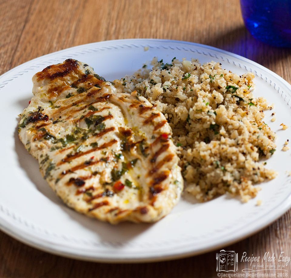 Marinated chicken with cauliflower couscous is low in fat and carbohydrates but high in flavour. Both the marinade for the chicken and the cauliflower couscous are flavoured with lime and coriander which brings a refreshing zingy flavour to the dish.
