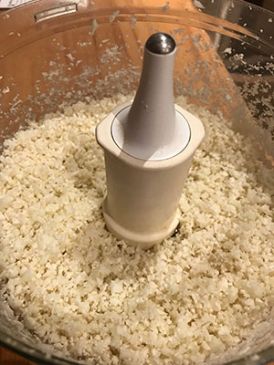 - Place the cauliflower florets in a food processor and using the pulse button, blitz in short bursts until the cauliflower has the texture of couscous.