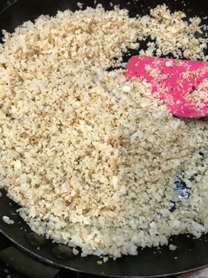 - Add the water and season well. Cover with a lid and cook for about 5 minutes until the cauliflower is tender and the water has evaporated. Keep warm.