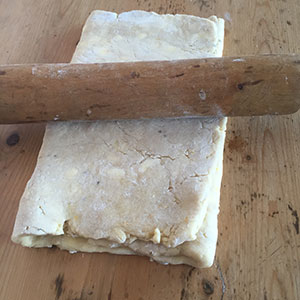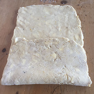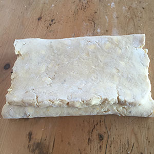 - Roll it out to a rectangle about 25cm x 50cm. With the short side towards you fold up one-third of the pastry, then fold the top third down so that you have 3 layers. Chill for 15 minutes.
