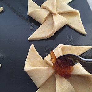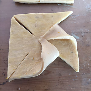 - Divide the pastry in half and rollout each piece to a 26cm square, then cut each into 4 equal squares. Brush with beaten egg. Cut each square diagonally from the corners halfway to the centre. Bring each of the four corners into the centre like a windmill and press into the centre.