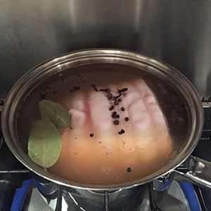 Over the years I have played around with how I cook my gammon and have settled on this way as my preferred method. Some recipes bake the gammon from beginning to end in the oven which, while ok for small joints, I find has a tendency to produce a rather dry joint. So I part cook my gammon by boiling it with a few aromatics. I make my own cider and so I usually boil the gammon in cider rather than water for added flavour (it also makes a nice stock for a risotto,so doesn't go to waste). You can use just water, or apple juice and water if you prefer.