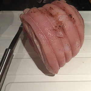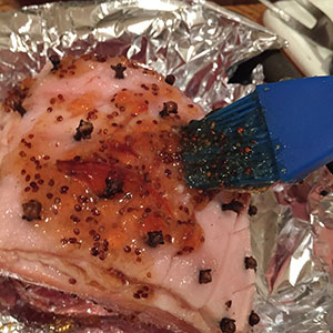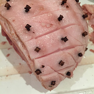 After the initial cooking I remove the skin, leaving a layer of fat. The fat is then scored in a diamond pattern and studded with cloves. I love the additional flavour the cloves give and they have the added advantage that they help stop the shreds of marmalade in the glaze from falling off.