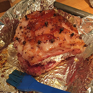 - Mix together the marmalade, honey and mustard and brush the mixture over the top and sides of the gammon. Roast for 15 minutes.