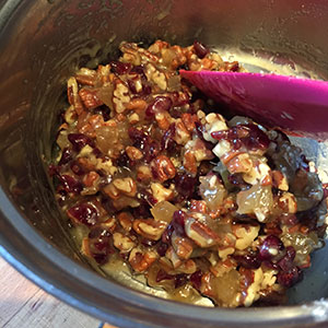 - Stir in the flour, cranberries, ginger and pecans and mix well.