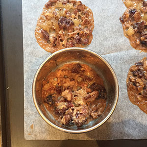 Florentines do tend to spread a lot when you bake them, so use a dessert spoon or teaspoon when placing them on the baking sheet, making sure you leave plenty of room for them to spread. Now they may not be well behaved and spread into perfect circles. Not to worry. As soon as you take them out of the oven, use a lightly oiled round cookie cutter, placed over each florentine and gently nudge the mixture into a neat circle using a circular movement. Allow to cool before removing from the baking sheet. If you are new to making Florentines you may find it easier to cook in small batches. Don't forget to line the baking sheet with baking parchment, that way you will have no fear of them sticking.