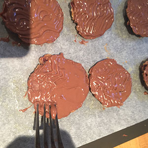 - Spread a second layer of chocolate over each florentine then use a fork to mark squiggles in the chocolate with a fork and allow to set.
